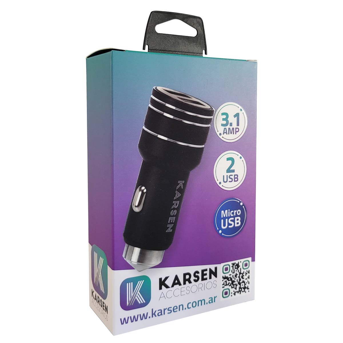 Cargador para auto Karsen Estruendo, 3,1A, Doble salida USB, Carga super rápida, Incluye Cable USB a Micro USB