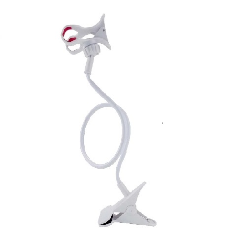 Soporte “tipo brazo” flexibles con abrazadera para engancharlo de una mesa o tabla. Compatible con celulares de 4 a 6 pulgadas. Elaborado en ABS. Con DOBLE CLIP de sujeción y abrazadera para engancharlo de una mesa o tabla.